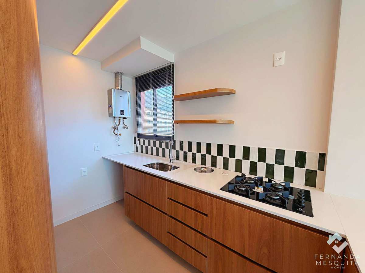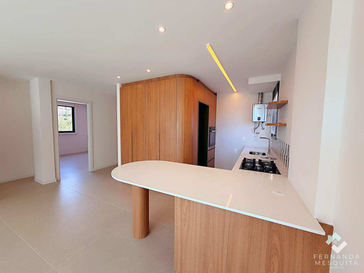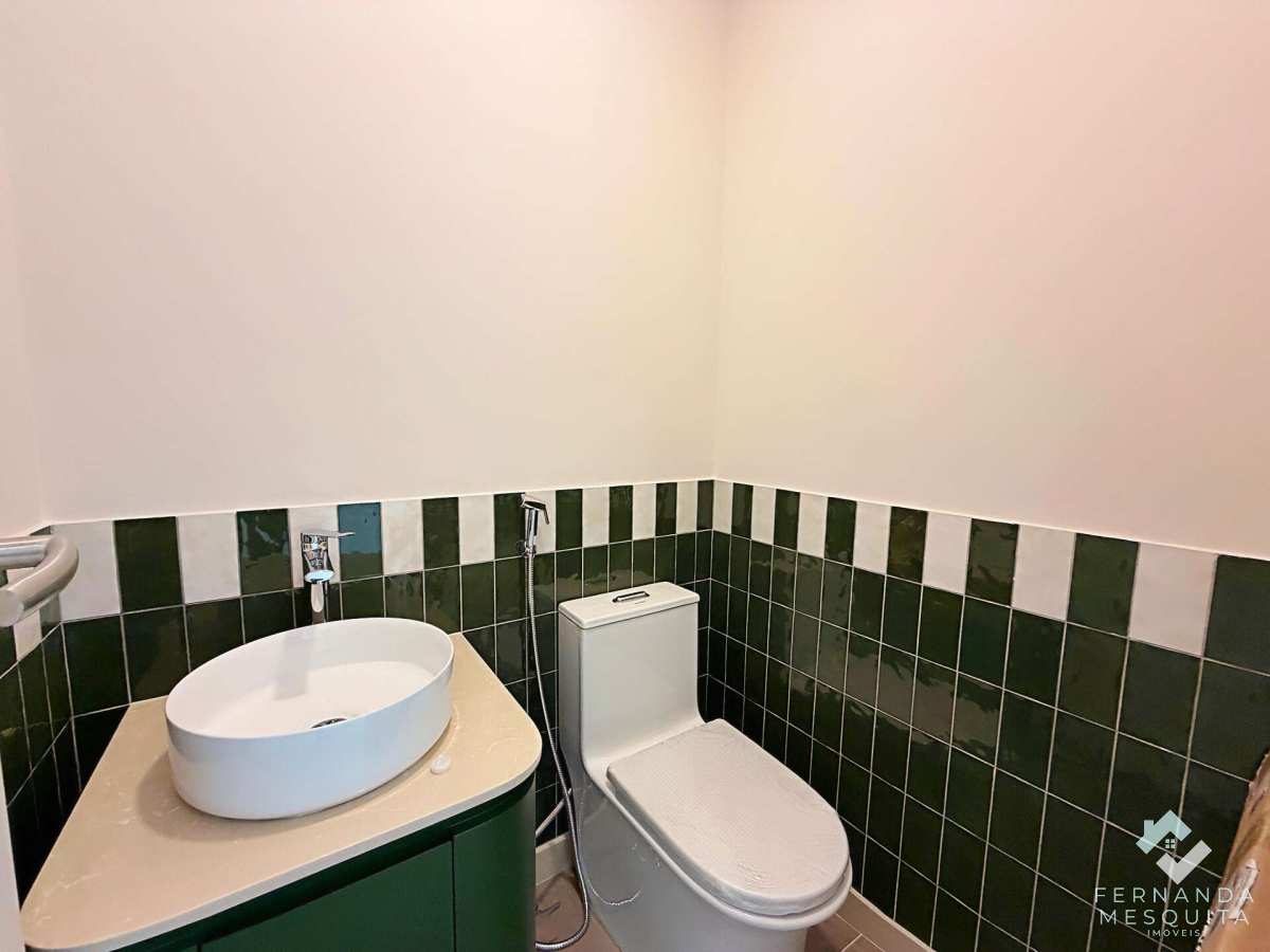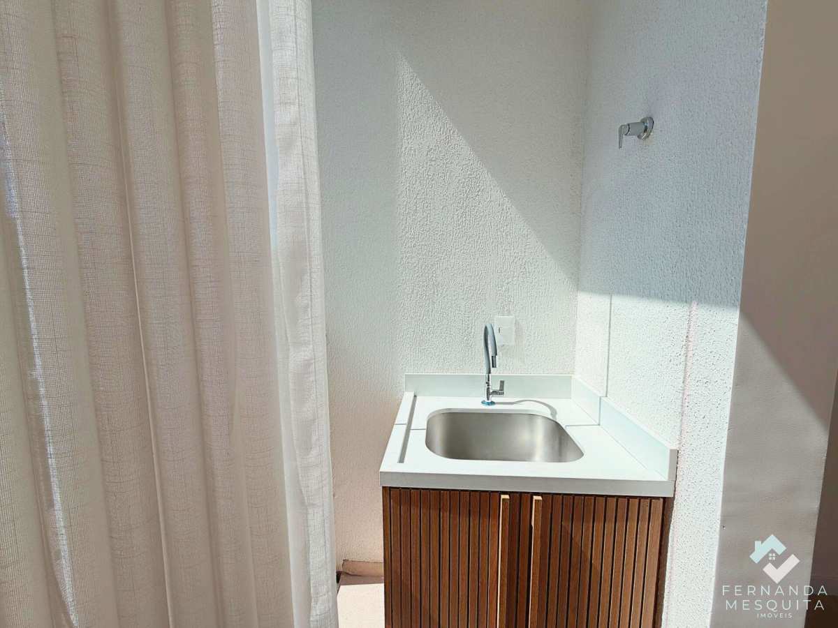 A charmosa cozinha já vem equipada com forno e cooktop, conectada à sala por uma bancada funcional. O imóvel oferece ainda um lavabo com acabamento de alto padrão, garantindo praticidade total para os moradores e visitantes.