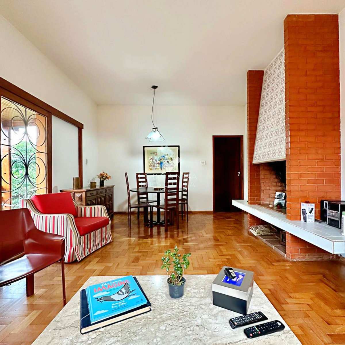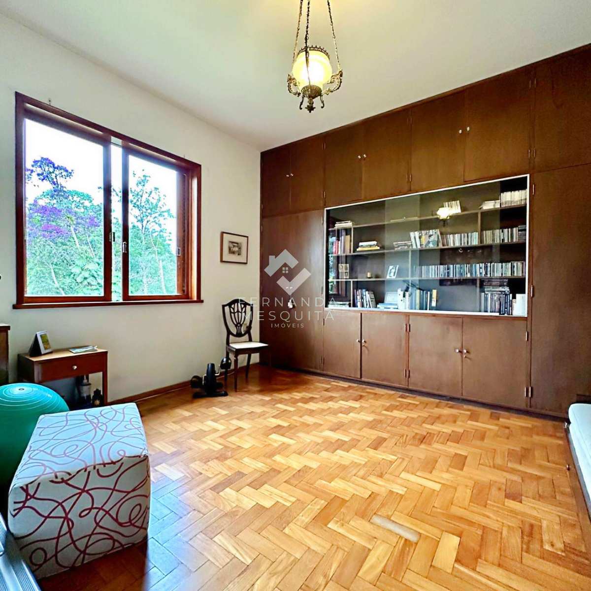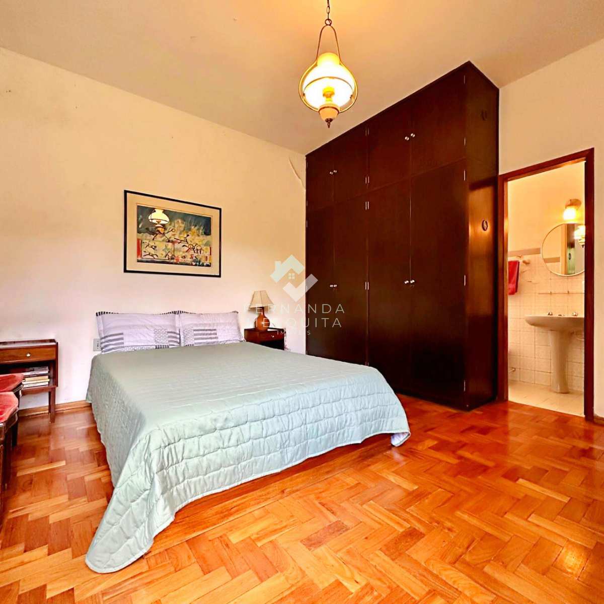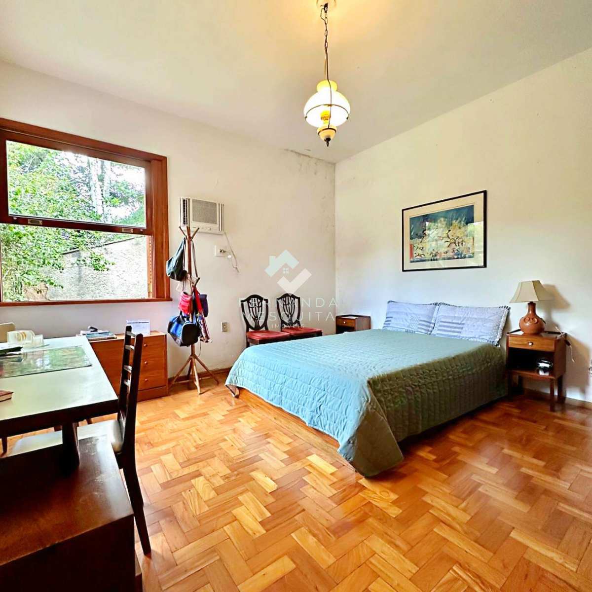 Na área externa, a propriedade conta com amplo quintal, jardim, pomar, quarto de ferramentas, dois quartos de apoio com banheiro, 2 vagas de garagem cobertas e estacionamento.