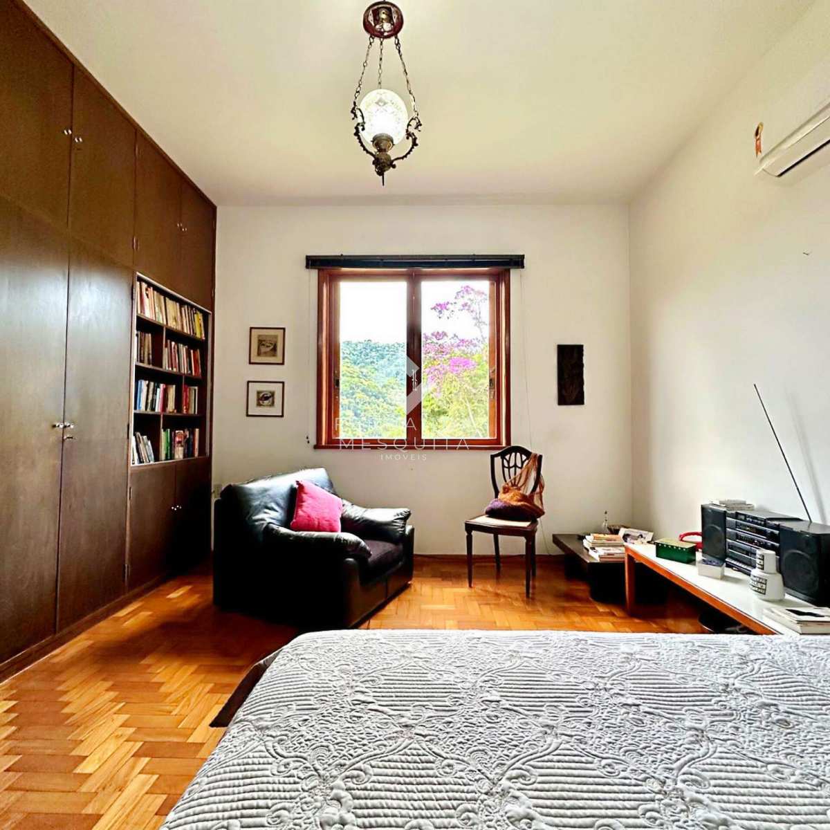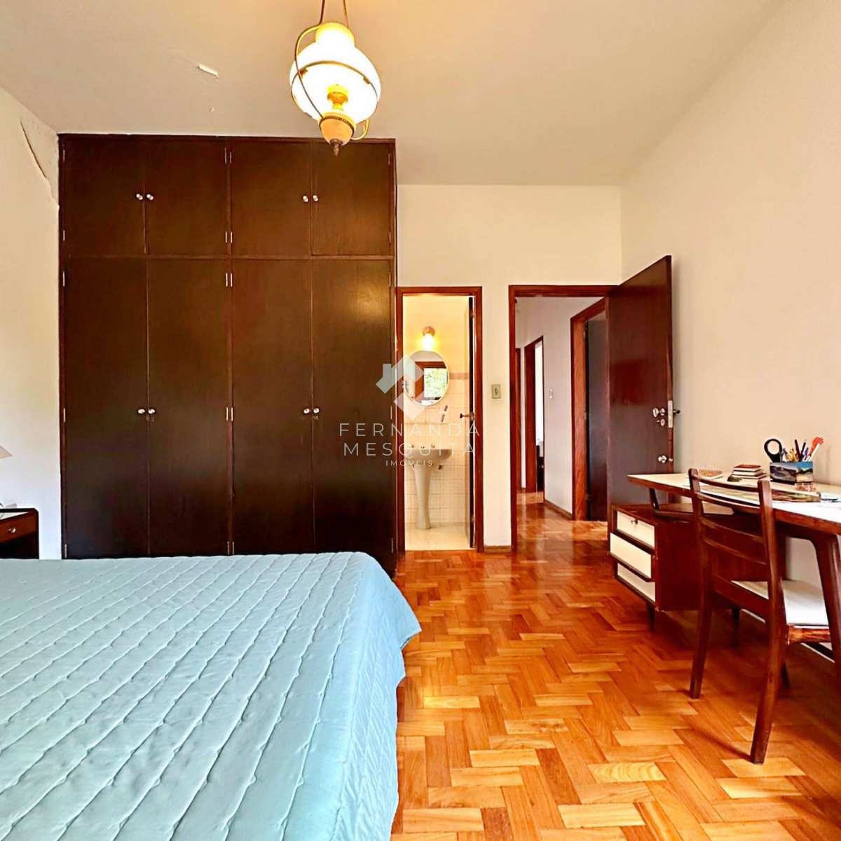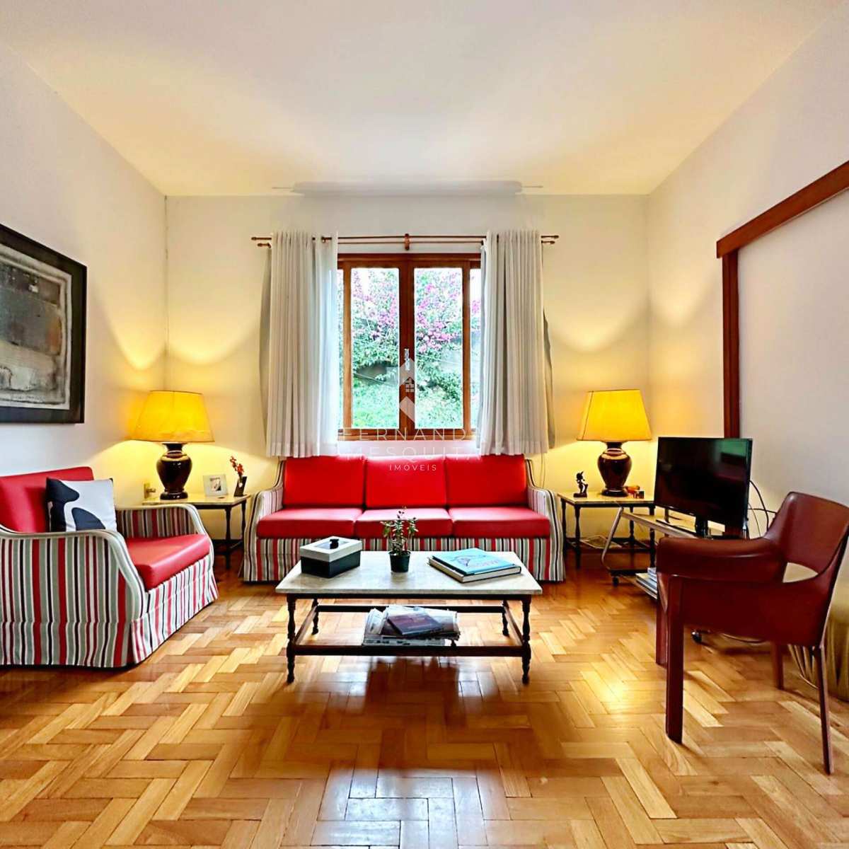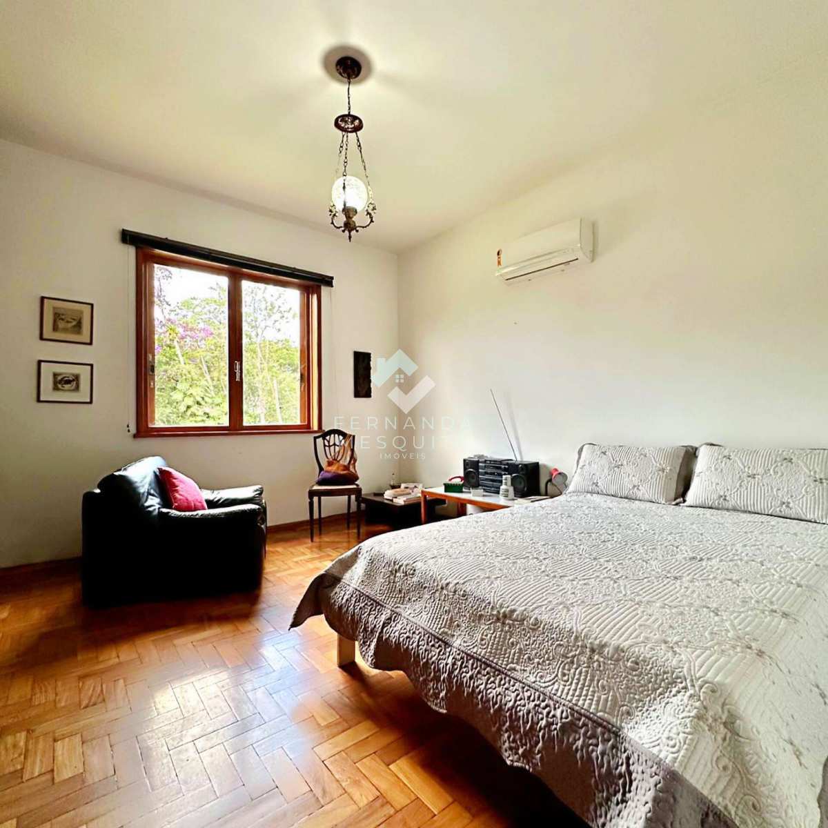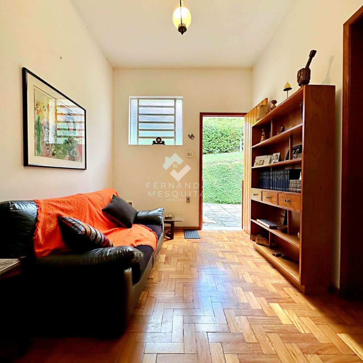 Na área externa, a propriedade conta com amplo quintal, jardim, pomar, quarto de ferramentas, dois quartos de apoio com banheiro, 2 vagas de garagem cobertas e estacionamento.