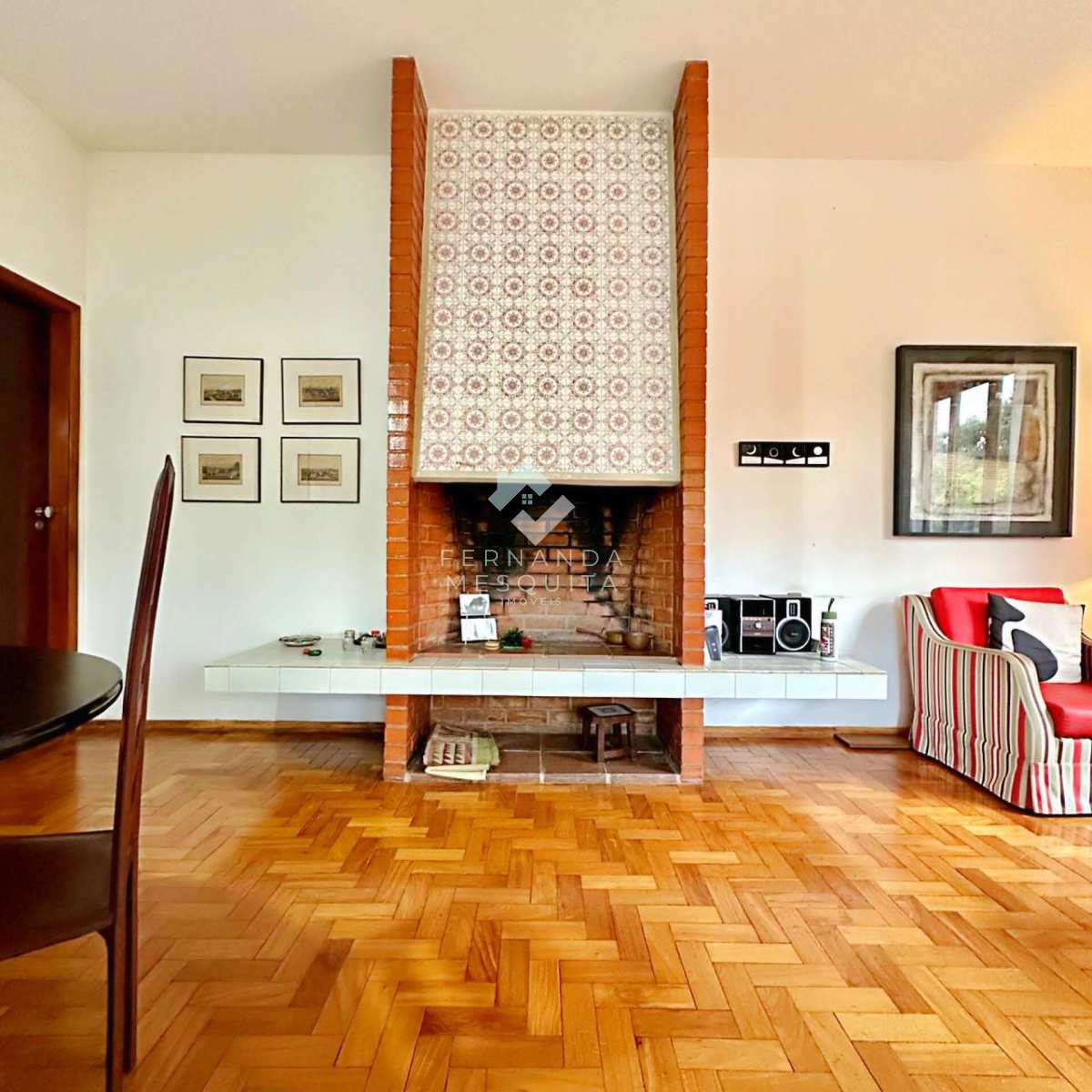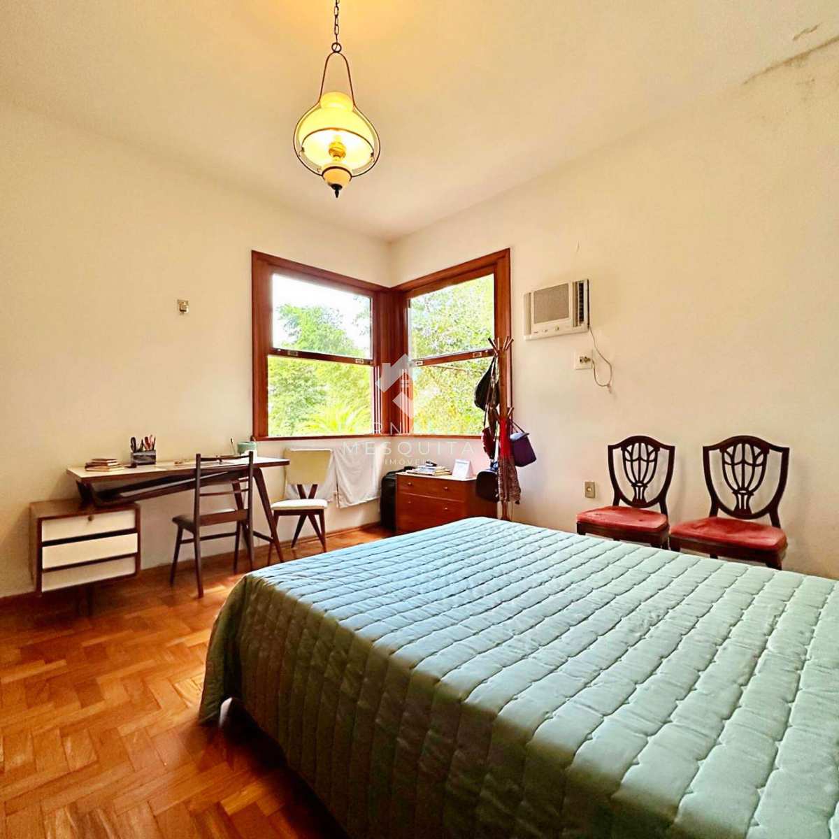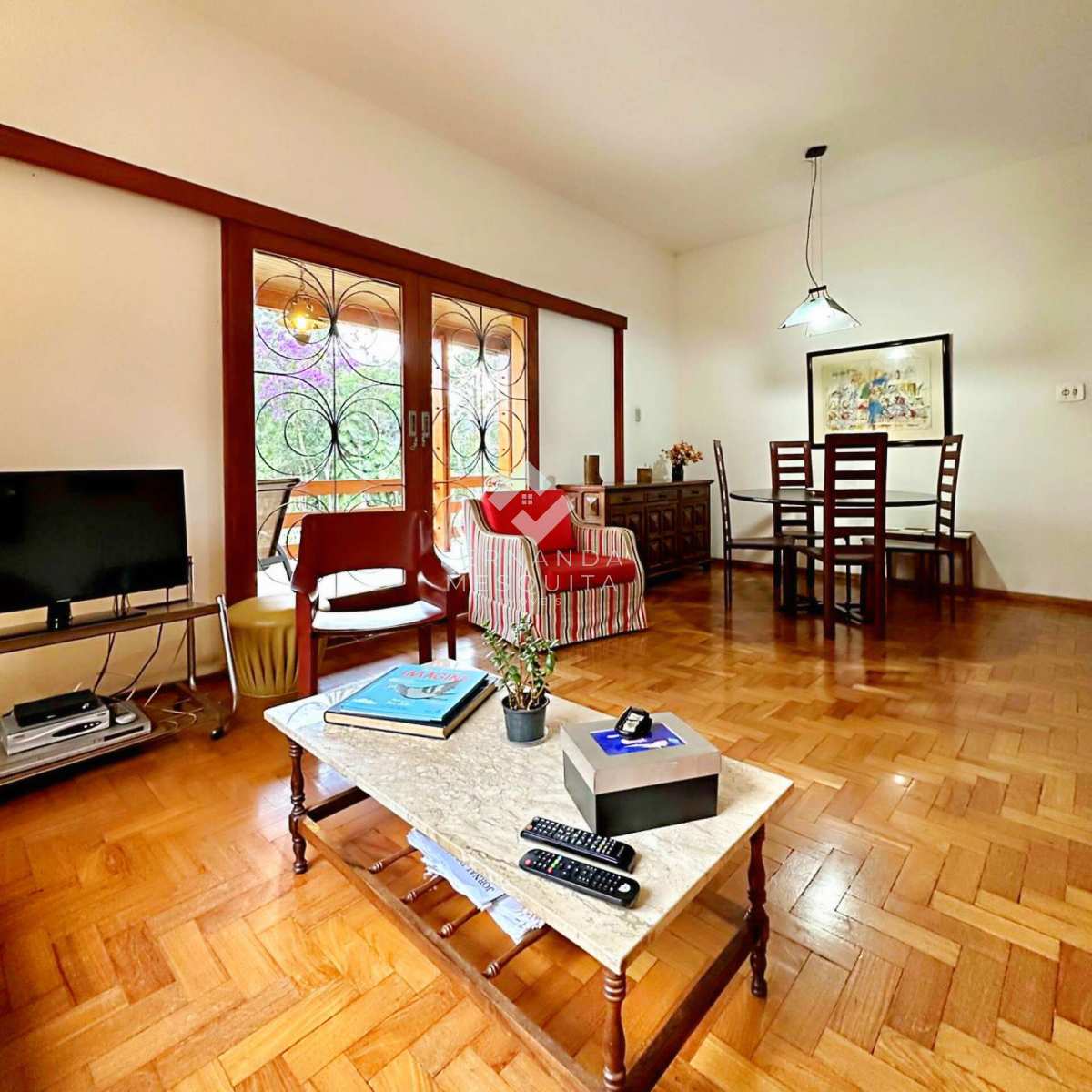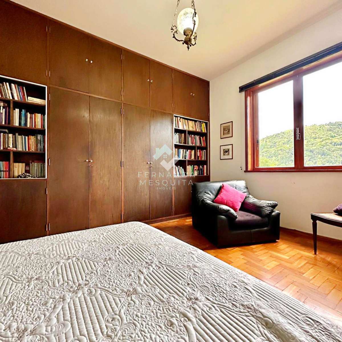 Na área externa, a propriedade conta com amplo quintal, jardim, pomar, quarto de ferramentas, dois quartos de apoio com banheiro, 2 vagas de garagem cobertas e estacionamento.