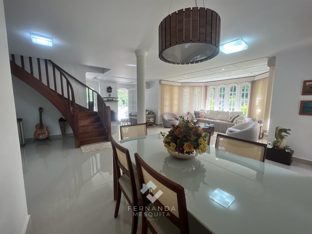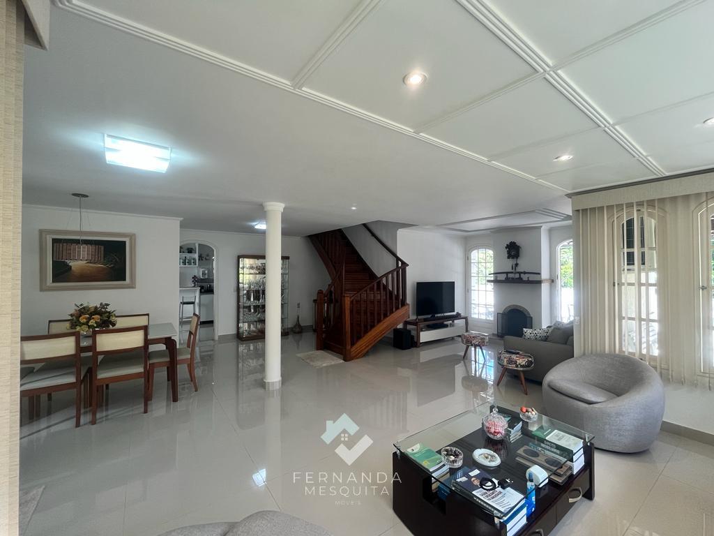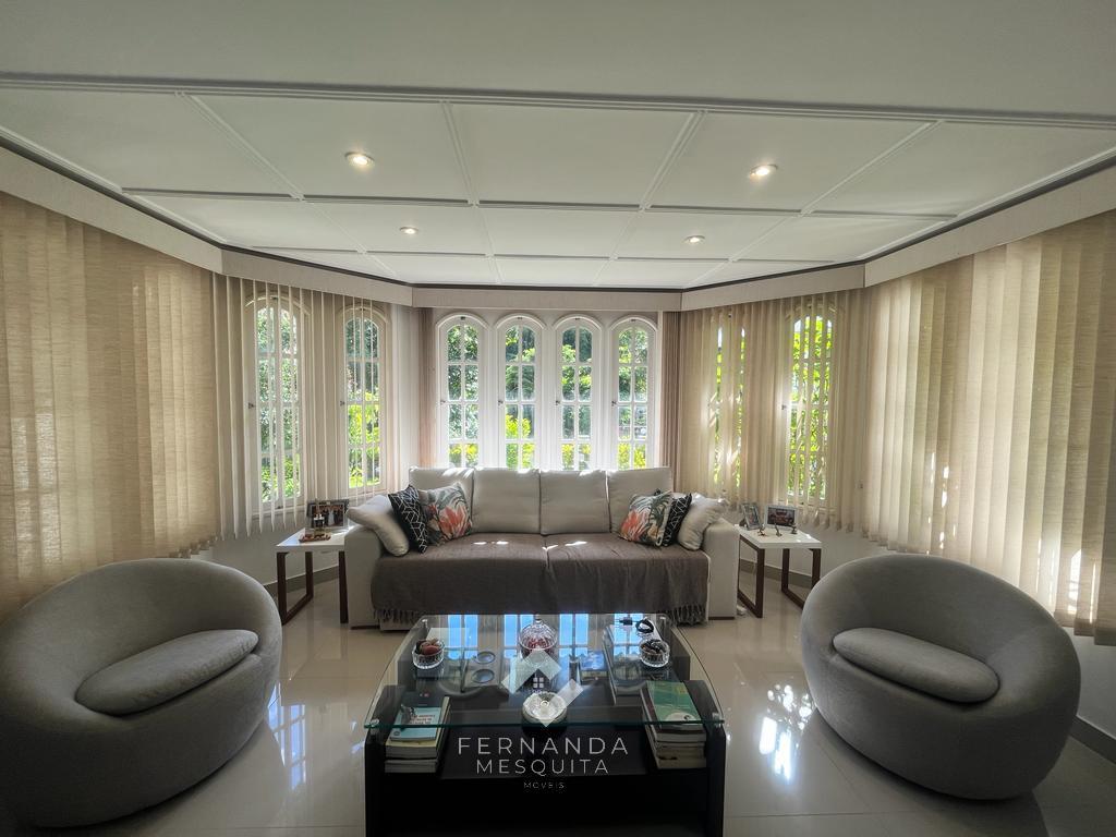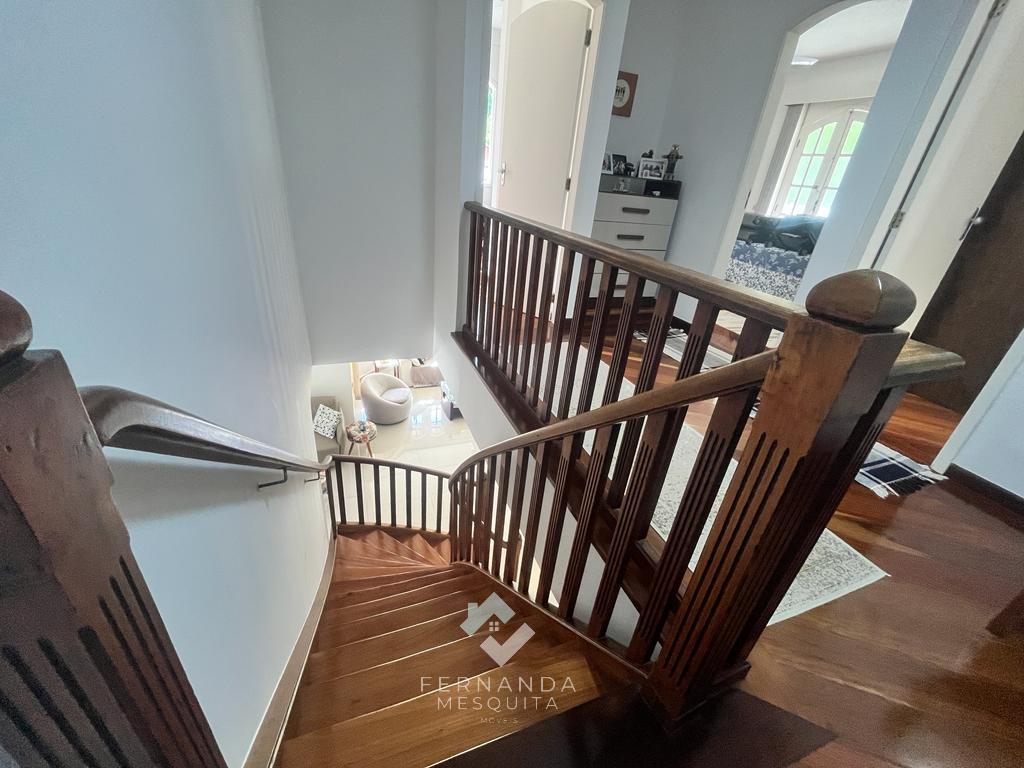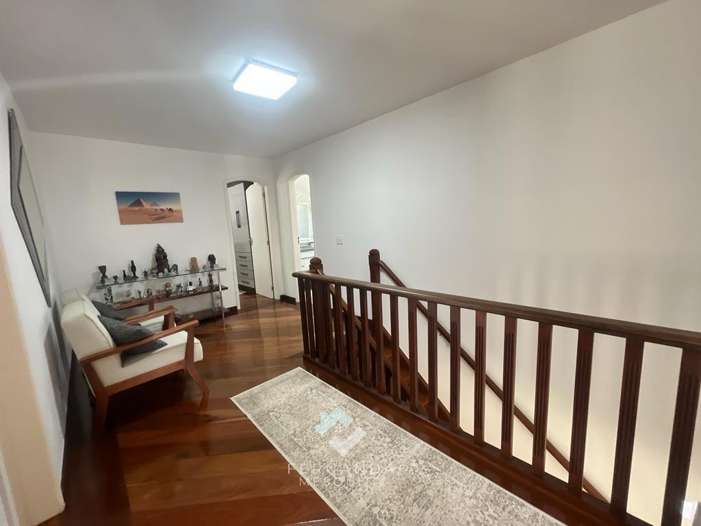 No primeiro andar, um espaçoso salão dividido em 3 ambientes, com lareira e uma varanda que oferece uma vista espetacular. Detalhes em gesso rebaixado e iluminação indireta tornam o ambiente acolhedor. Além disso, há um banheiro social, uma copa/cozinha com armários, área de serviço e uma dependência completa para empregados.