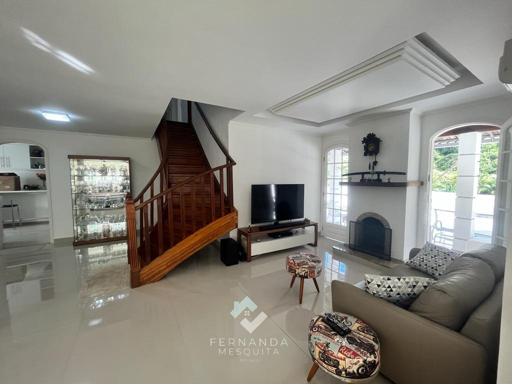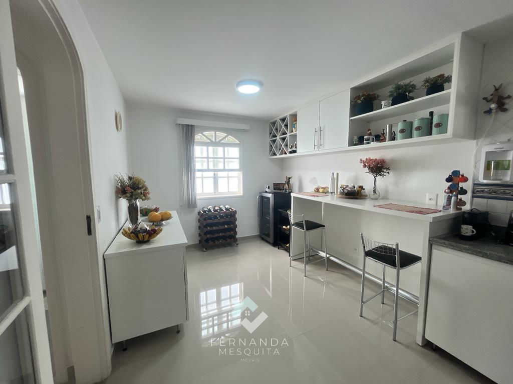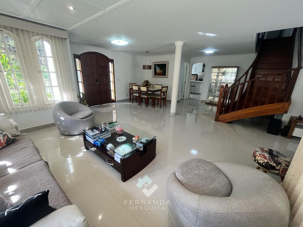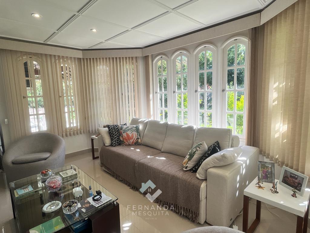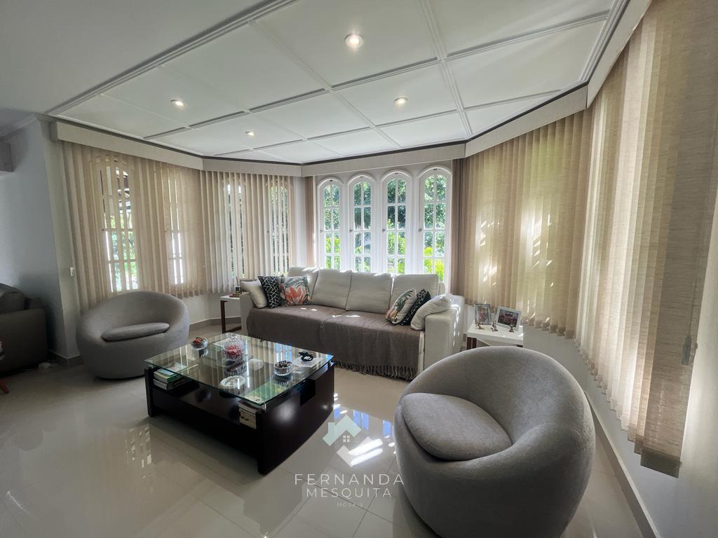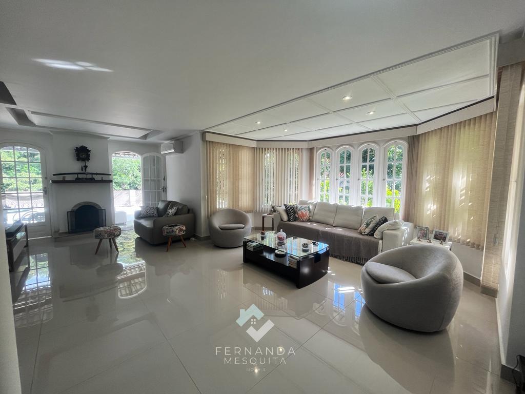 No primeiro andar, um espaçoso salão dividido em 3 ambientes, com lareira e uma varanda que oferece uma vista espetacular. Detalhes em gesso rebaixado e iluminação indireta tornam o ambiente acolhedor. Além disso, há um banheiro social, uma copa/cozinha com armários, área de serviço e uma dependência completa para empregados.